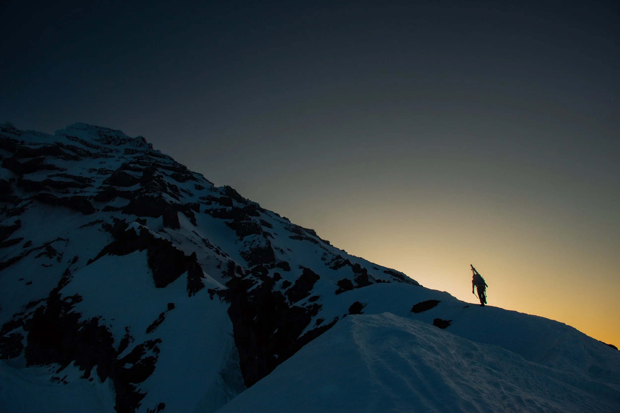 Here, the subject is small and on the right third. Silhouetted against the rising sun, he is traveling left, bringing the eye the the large snow and rock cliffs above. An early morning on the Success Cleaver, Mt. Rainier.