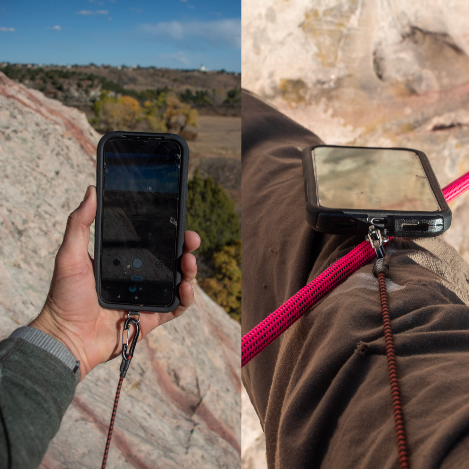 Phone Necklace: You can find several options on Amazon(or make one yourself). Any tether that has an attachment that fits behind a case, with a loop that comes down by the charging port, are generally pretty secure. The advantage of the necklace is it’s out of they way of your harness, and you don’t have to try to fit it in and out of your pockets. This can be helpful during hanging belays. The disadvantage is if you’re a hot weather climber who wears thin shirts, or no shirt at all, it will dangle around which can get annoying as you’re cruxing out.