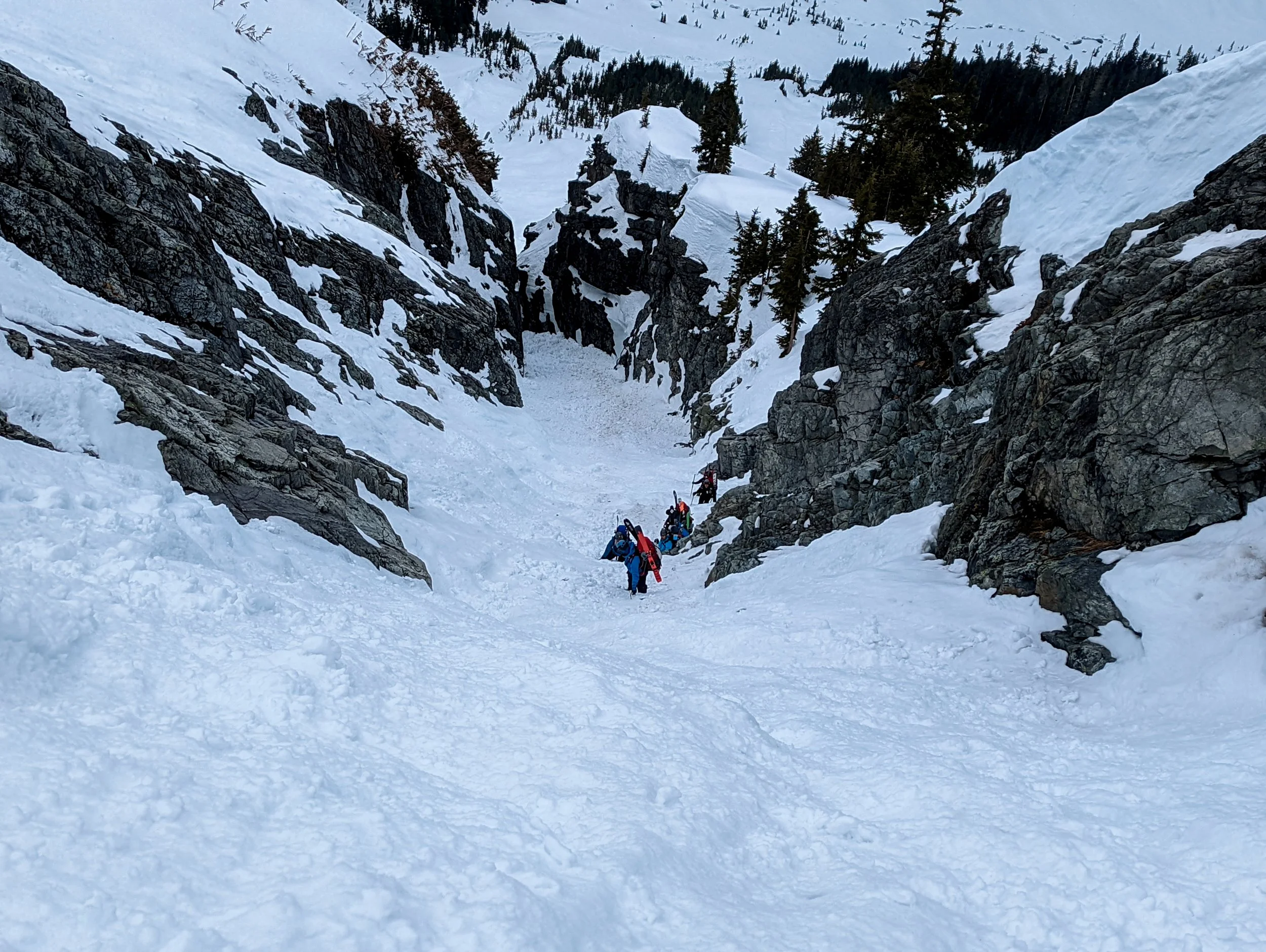Once in the trees, things became more manageable. The snow was still wet, and we started purposely triggering wet loose slides that built up and cleared out a line down. This movement was slow and methodical, because at this point the safety of the group was the biggest concern, and the avalanche hazard was our biggest threat. After several hours of being on edge, the ground flattened out, and we had made it to the bottom, out of any avalanche terrain. It was a sigh of relief. Between the leadership of the more experienced and the calm and coolness of the rest, we were able to safely get down.