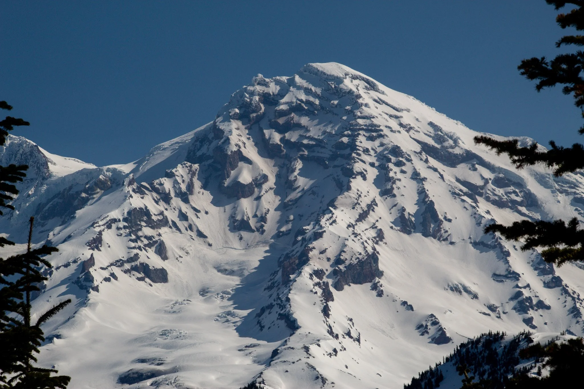 We topped out on Point Success a little after noon. We were in no rush, as the upper mountain was quite firm, and wanted to descend around 2-3pm to ski some corn. After taking in the views, we made the longer-than-it-seems slog over to the crater. We breifly roped up, although probably unnecessary. This section doesn’t seem to get crevasses, and I’m not sure what is or is not officially “glacier”, but I do know you don’t have to stray very far to be next to the massive crevasses that the upper Nisqually has. If you do a straight line from Point Success to Columbia Crest, you *should* be fine.